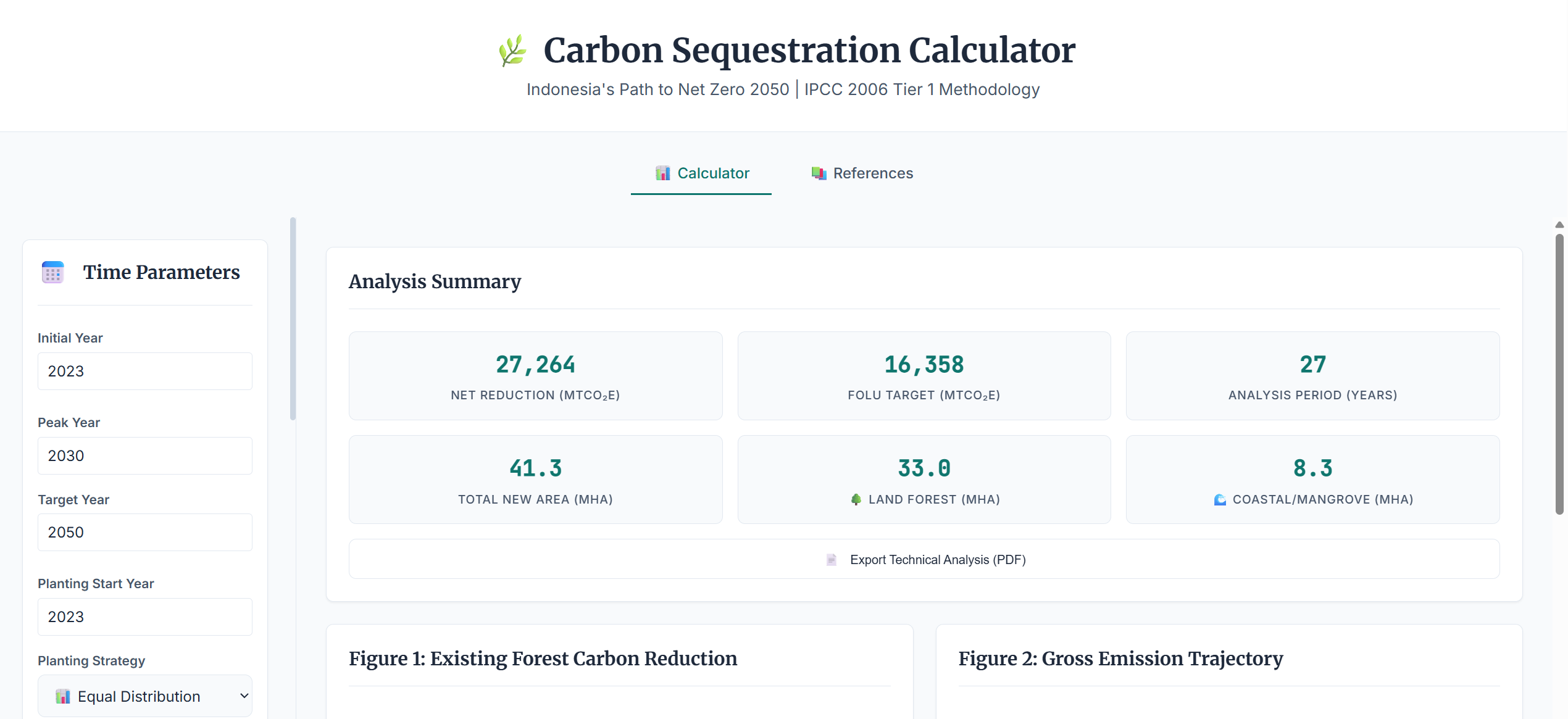 This project is a full-stack analytical suite developed to model Indonesia's National Net Zero Roadmap. It provides a numerical simulation engine that calculates the required reforestation and coastal restoration areas needed to achieve specific carbon abatement targets by 2050. The application bridges the gap between high-level climate policy and actionable land-use requirements through rigorous data modeling and scientific validation.